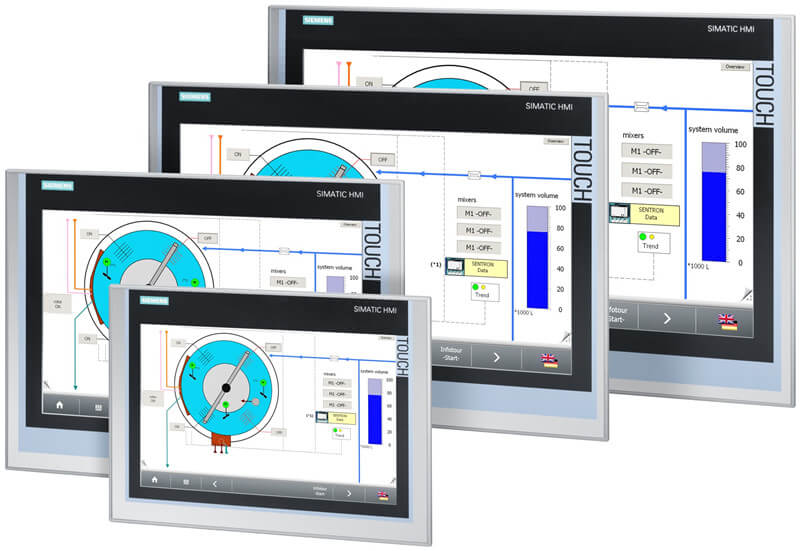 • 12英寸设备KP1200和TP1200 Comfort具有分辨率为1280x 800像素的PC典型显示屏。设备的Runtime Software包括档案和脚本、互联网浏览器,在交付时还包括PDF阅读器,Excel和Word文件。Comfort Panel的触摸面板系列可在横向或竖向安装和运行,当配置它们时您只需选择正确的方向。